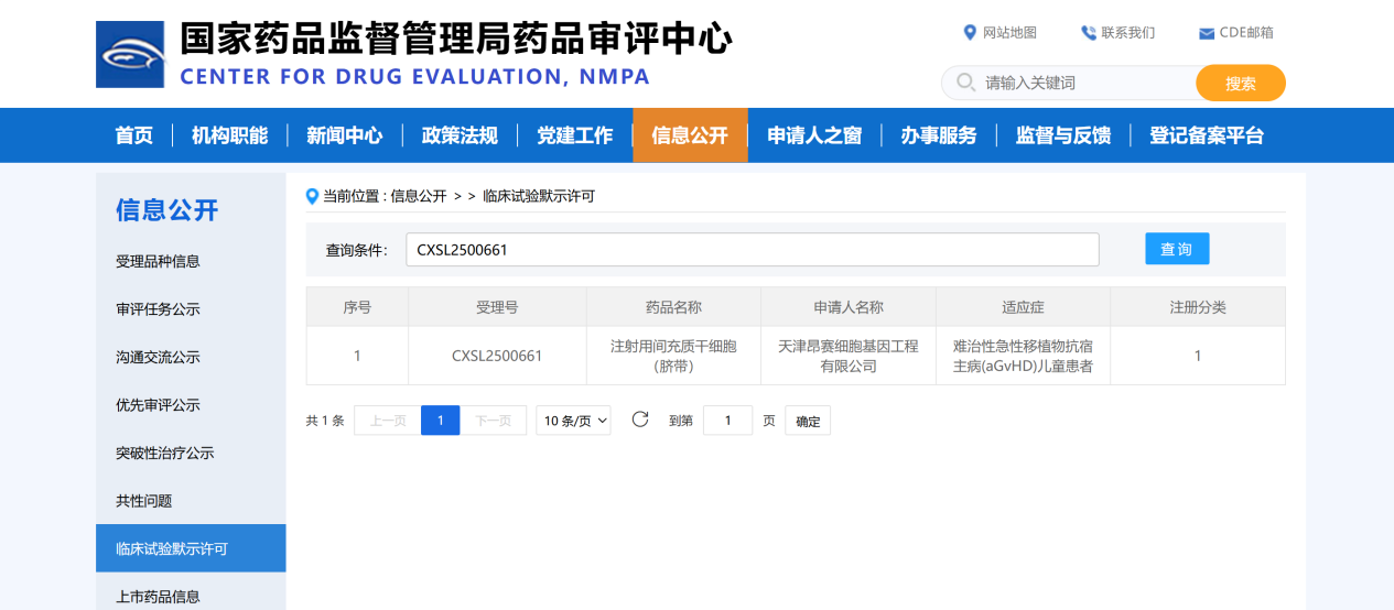 2025年11月3日, 天津昂賽細(xì)胞基因工程有限公司申報(bào)的注射用間充質(zhì)干細(xì)胞(臍帶)治療難治性急性移植物抗宿主?。╝GvHD)兒童患者的適應(yīng)癥獲得國家藥品監(jiān)督管理局臨床試驗(yàn)?zāi)驹S可